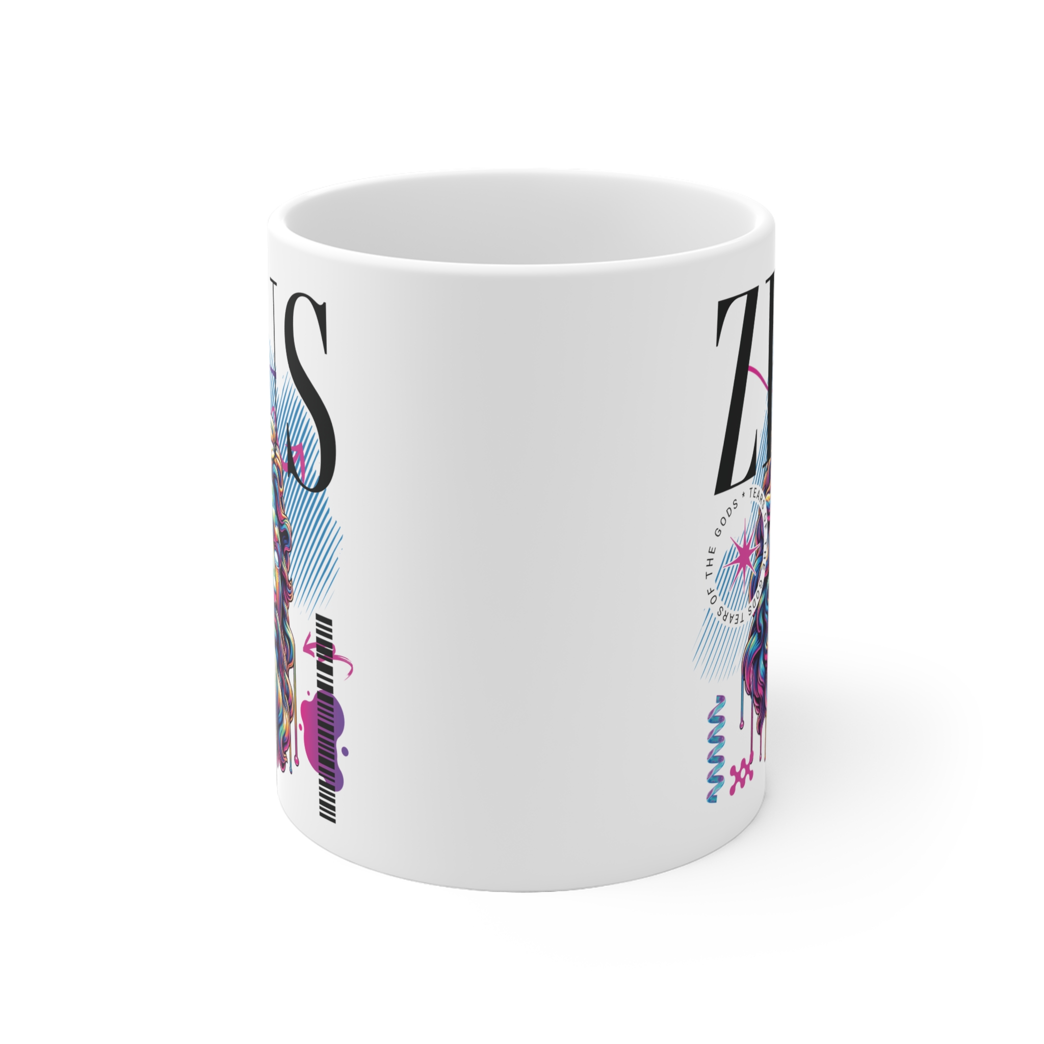 Ten kubek 330ml z grafiką ZEUS – TEARS OF THE GODS to nie jest zwykłe naczynie na poranną kawę. To boski pojemnik na emocje, styl i herbatę z miodem. Na froncie masz nadruk ZEUSA, który wygląda jakby właśnie obejrzał wzruszający film i postanowił uronić kilka tęczowych łez. Kolory? Neonowe. Klimat? Kosmiczny. Efekt? Kubek, który wygląda jakby miał własną playlistę lo-fi z greckim dramatem w tle.