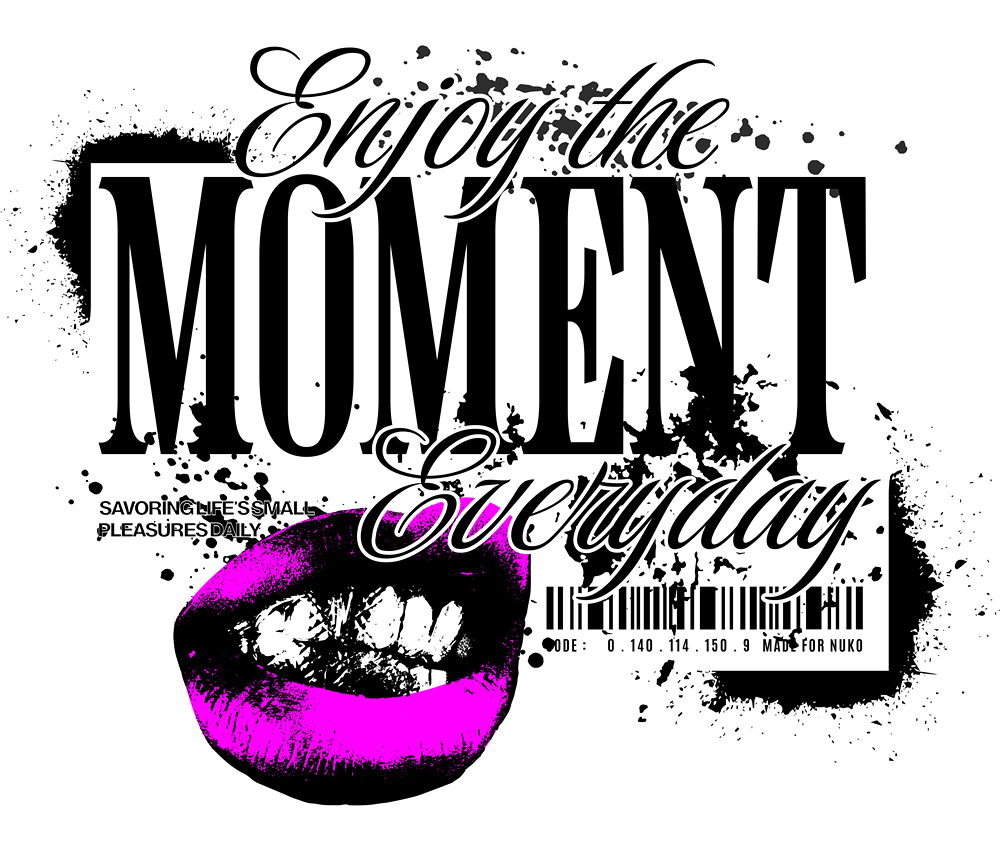 Z lewej strony uśmiecha się do ciebie grafika ust w stylu pop-art różowe, z zębami, trochę jakby mówiły „no i co zrobisz?”. Z prawej strony kod kreskowy z podpisem "MADE FOR NUKO", który wygląda jakbyś właśnie kupił coś limitowanego. Bo tak jest.